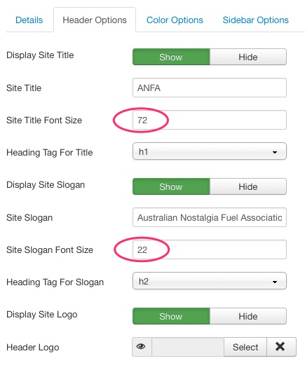 Site Slogan Font Size are defined in my template in TT, though I had to set these or the default values here would override whatever was in the template.